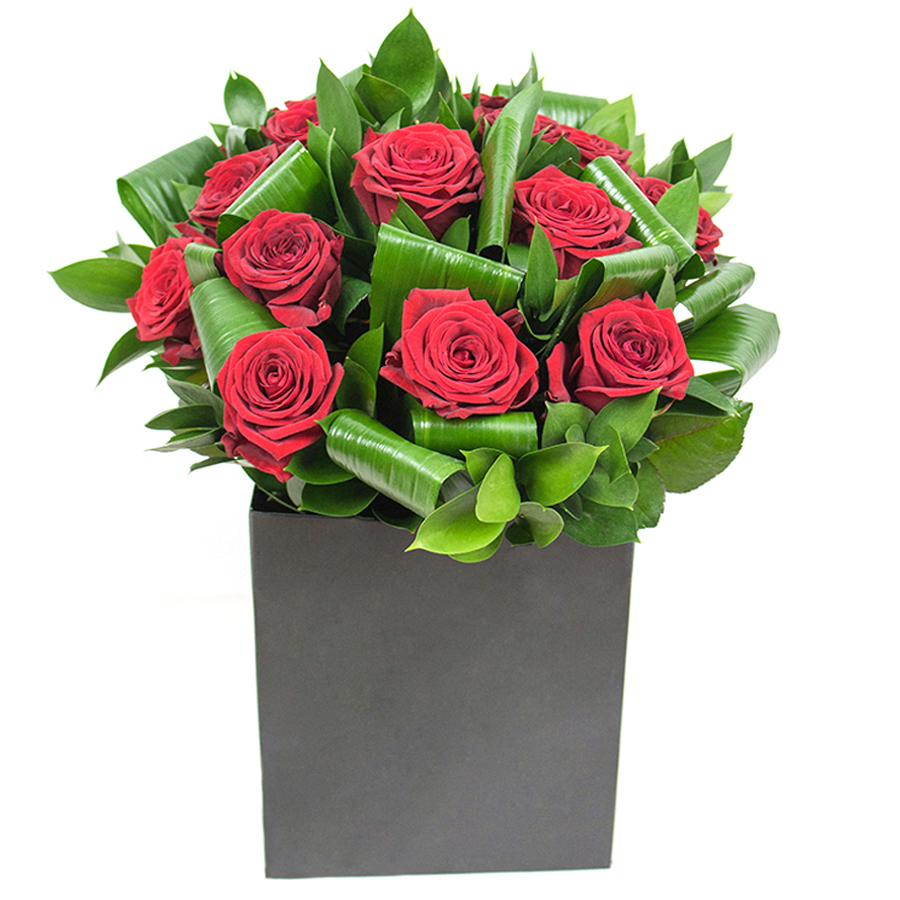 Celebrate beauty with our timeless bouquet, featuring classic red roses, lush aspidistra leaves, and verde ruscus. This unique design brings elegance and sophistication to any space.