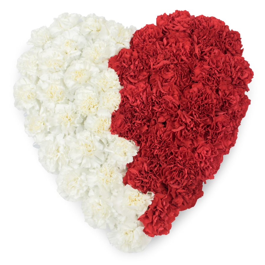 Express your feelings with our heartfelt mixed carnations arrangement, showcasing white and red carnations in a beautiful heart design.